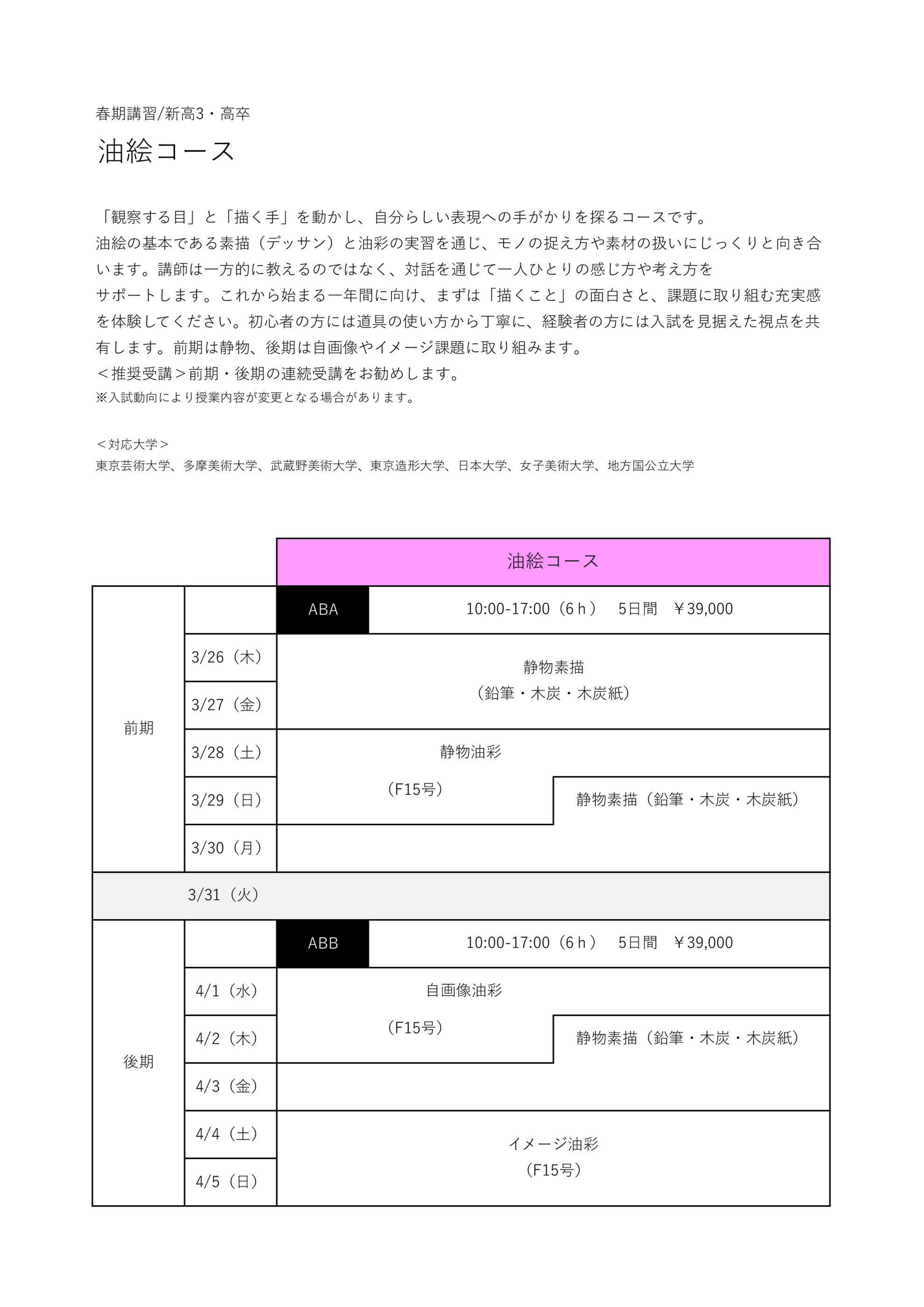 ※新高1・新高2は「高校1・2年生科 アドバンスコース 油絵専攻」をお申し込みください。