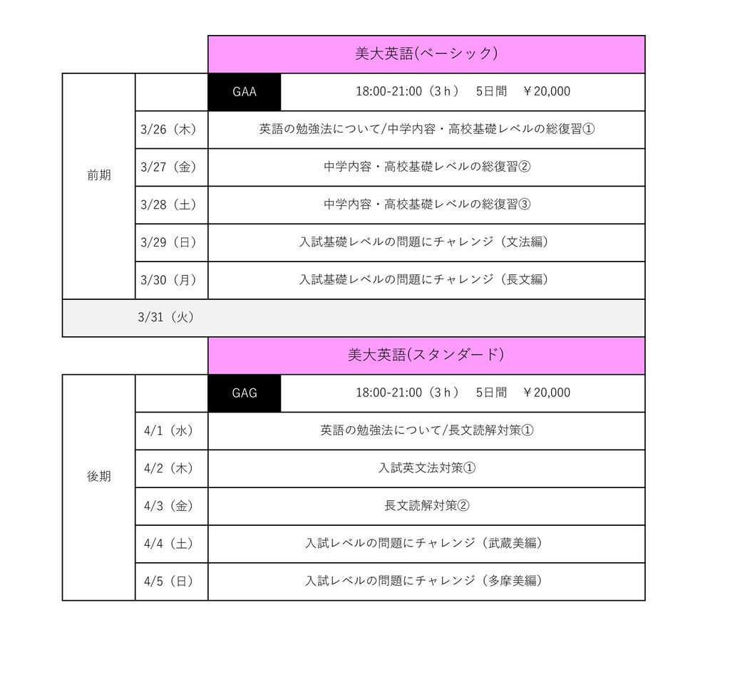 ●美大英語スタンダード:高校中級以上の文法復習に加え、本格的な長文読解に取り組みたい方のための講座です。読解のポイントを効率よく学び、入試で得点源にするための実戦力を養います。