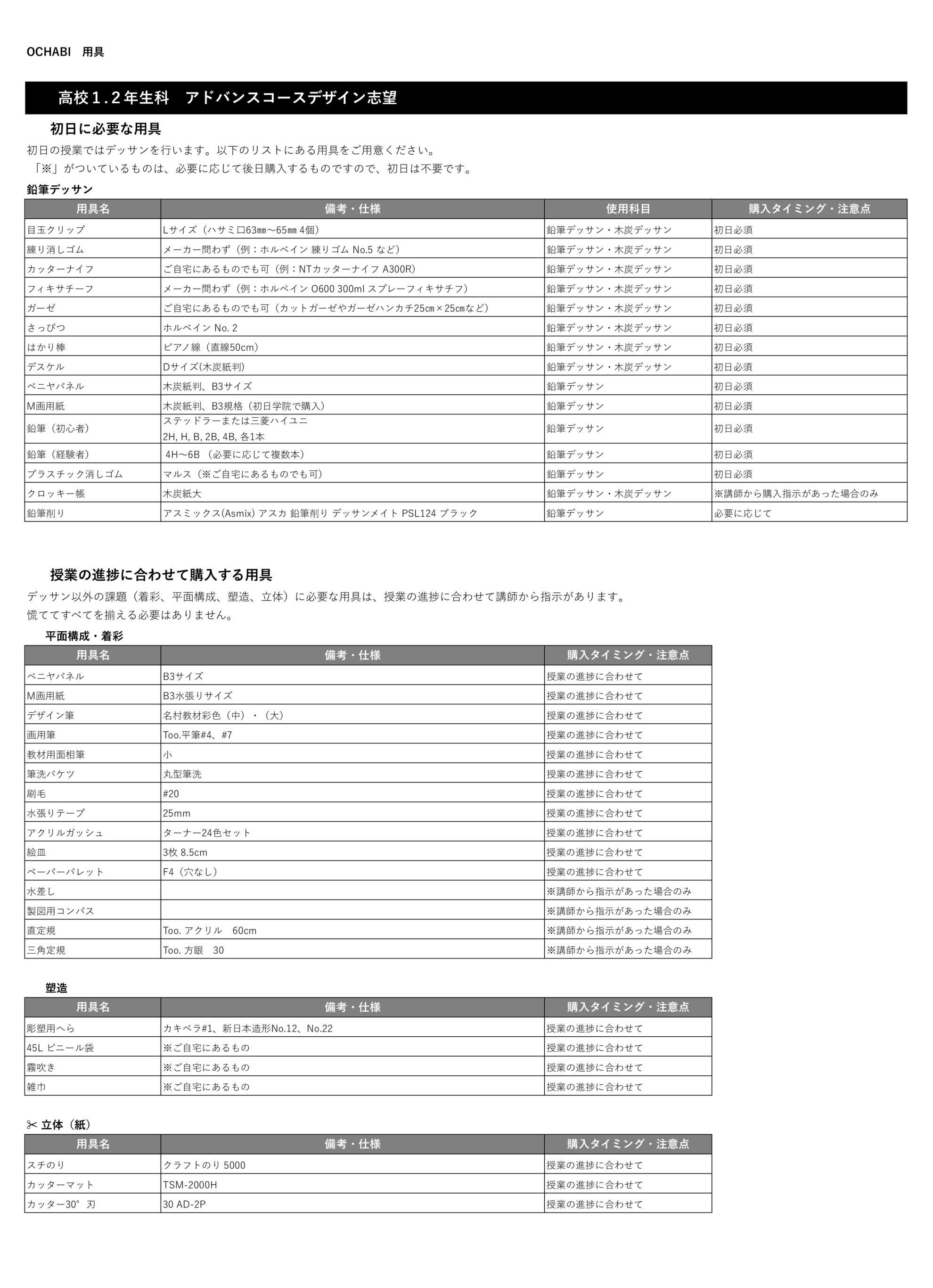 ▶ 高校1・2年生科 アドバンスコース デザイン志望持参用具リスト【PDF】